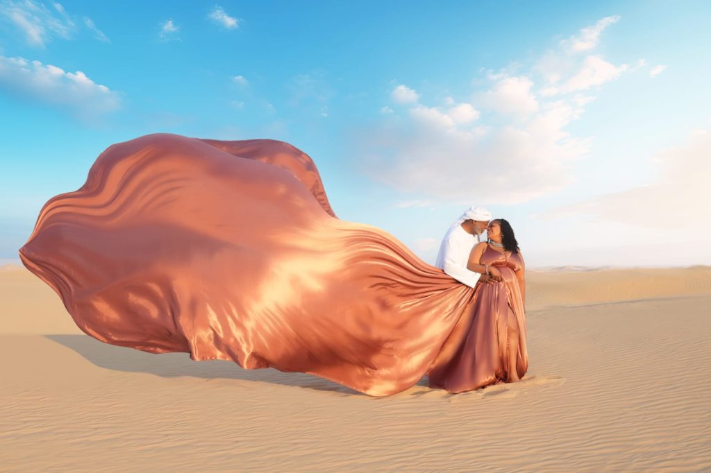 What makes Dubai truly special is how naturally it enhances the flow of a Flying Dress Dubai. The gentle wind on the beaches, the open space of the desert, and the reflective surfaces of modern buildings all help the fabric move beautifully. Each area tells a different story: Downtown feels modern and bold, Jumeirah offers luxury and beach views, Dubai Creek adds culture and warmth, and the desert gives you pure, natural beauty. With so many unique settings, your photoshoot becomes more than just taking pictures—it becomes a beautiful journey through Dubai’s most iconic scenes.